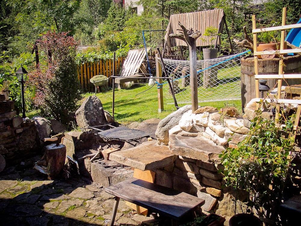 Poniżej salonu jest piwnica regionalna z kuchnią, kominkiem i łazienką. Z piwnicy wychodzi się do ogródka i własnego grilla.